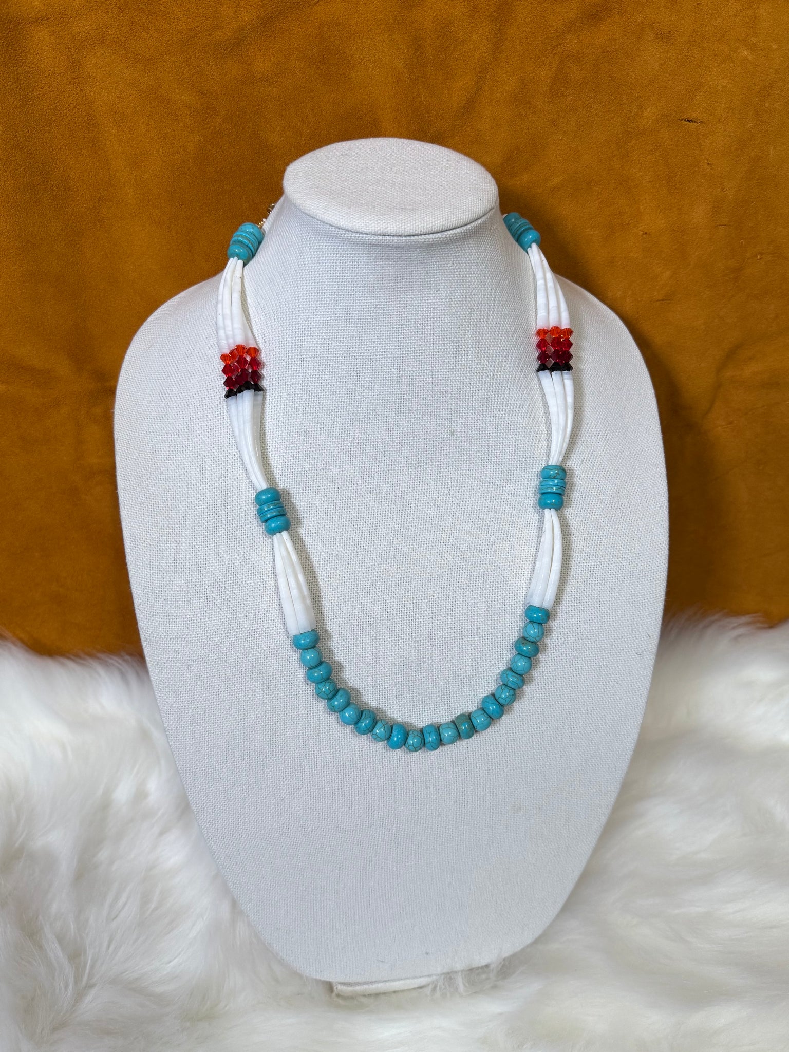 • This piece is made with dentalium shells, turquoise beads, preciosa czech crystal bicone beads, 24kt gold beads, deer hide, and gold plated findings.