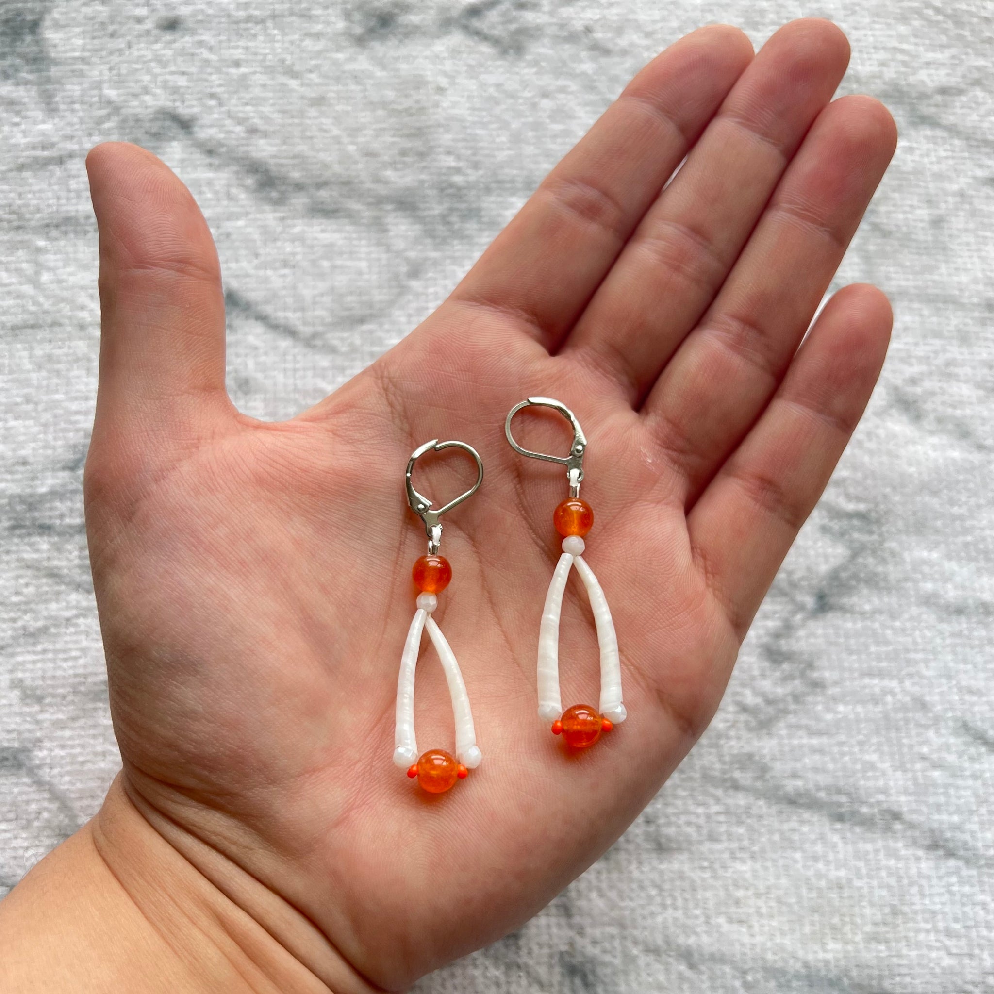 The earrings are 2 inches long. They are made with nickel-free lever back hooks, wire guards, dentalium shells, size 11 seed beads, and glass beads.