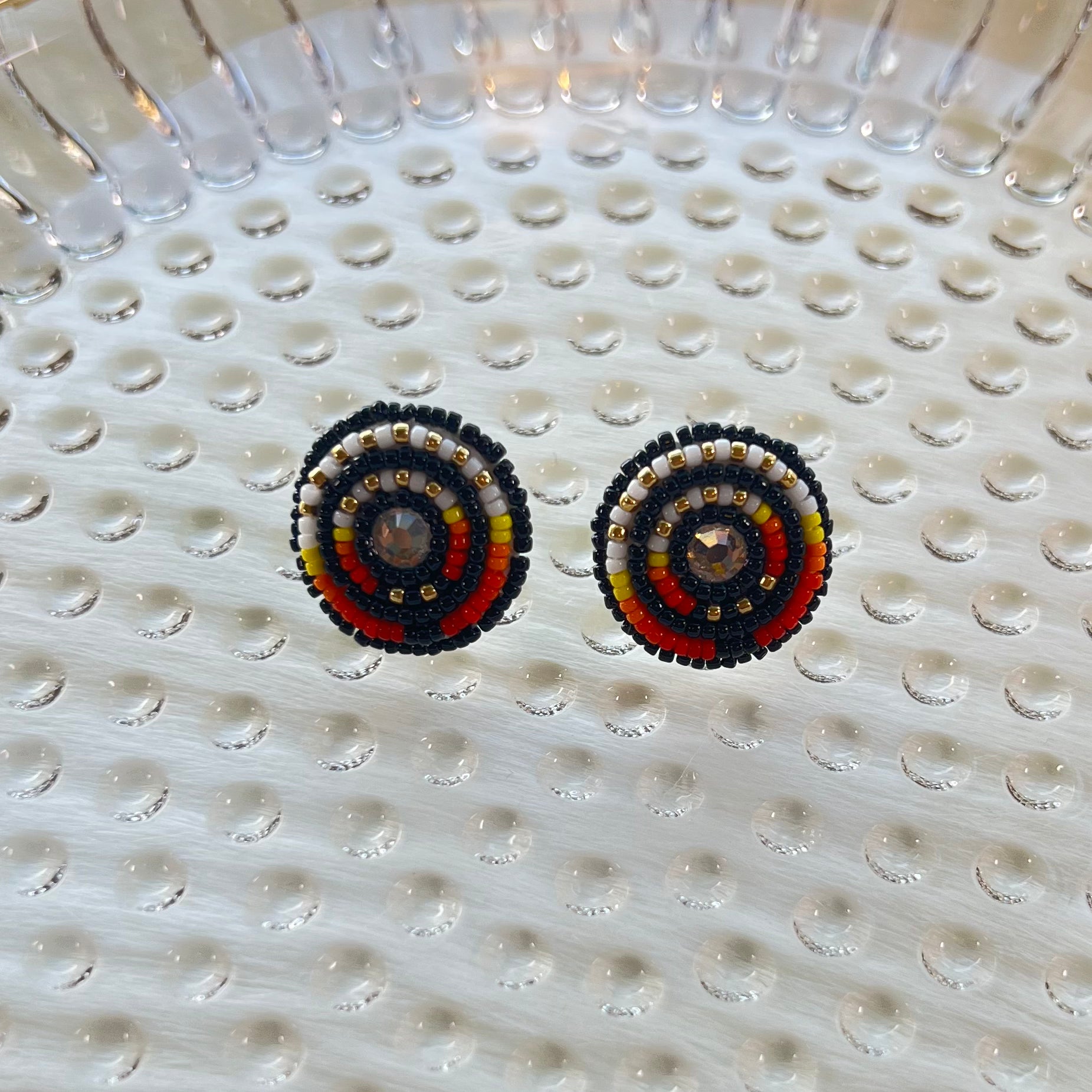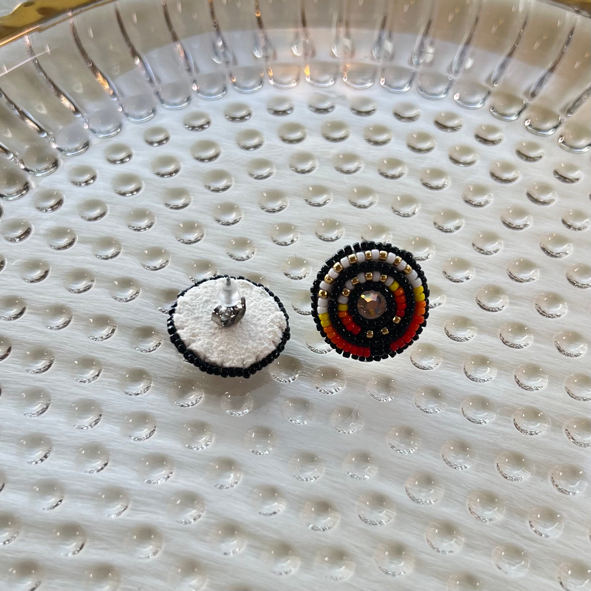 This pair of earrings are made with nylon thread, nickel free studs, Swarovski crystal gems, 24kt gold plated beads, and size 15 seed beads.