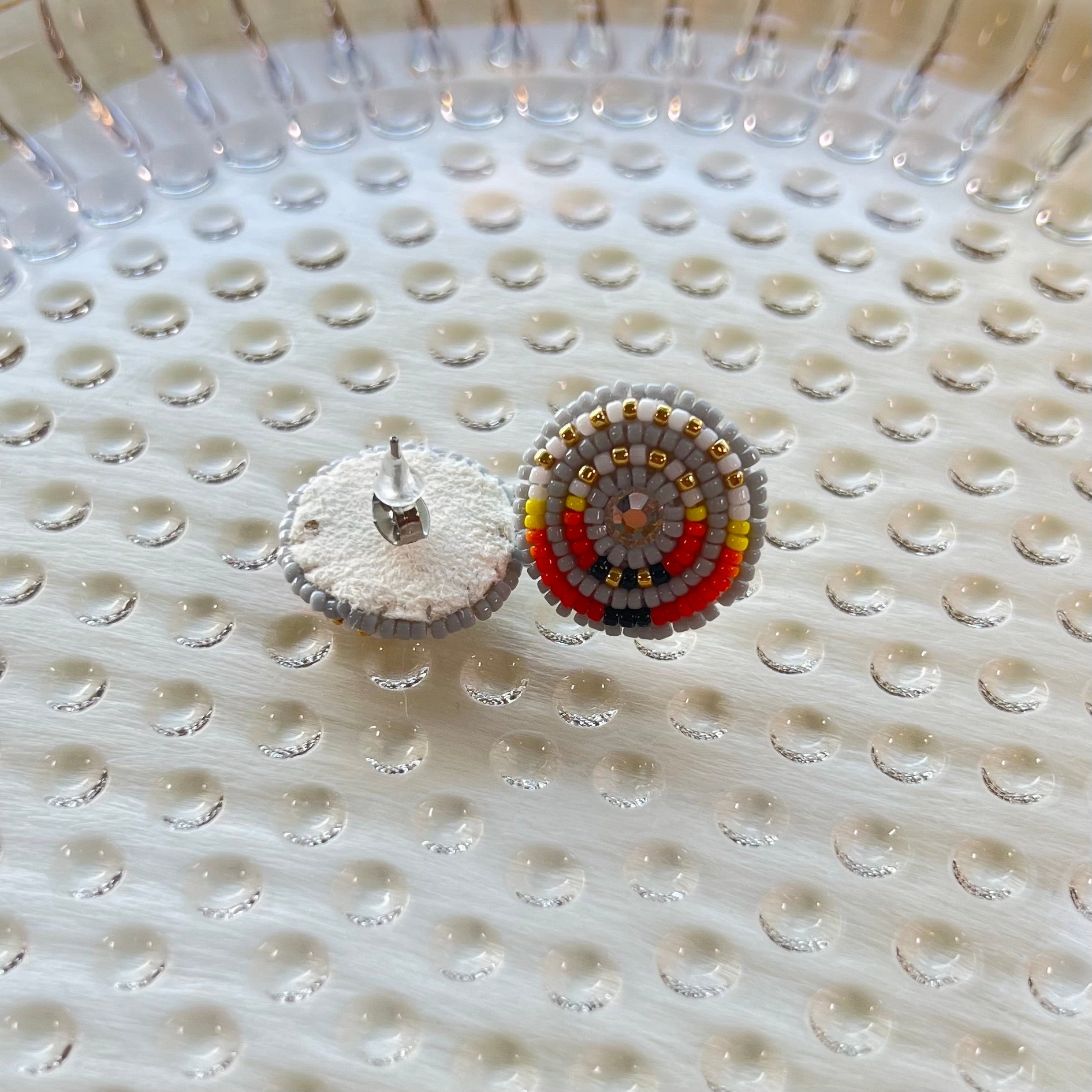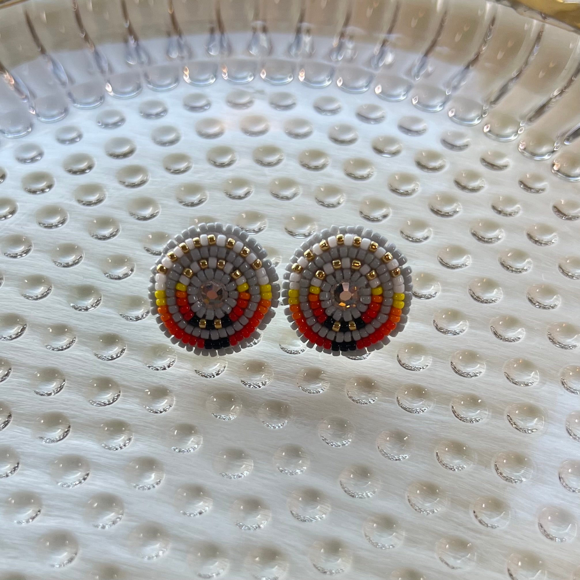 This pair of earrings are made with nylon thread, nickel free studs, Swarovski crystal gems, 24kt gold plated beads, and size 15 seed beads.