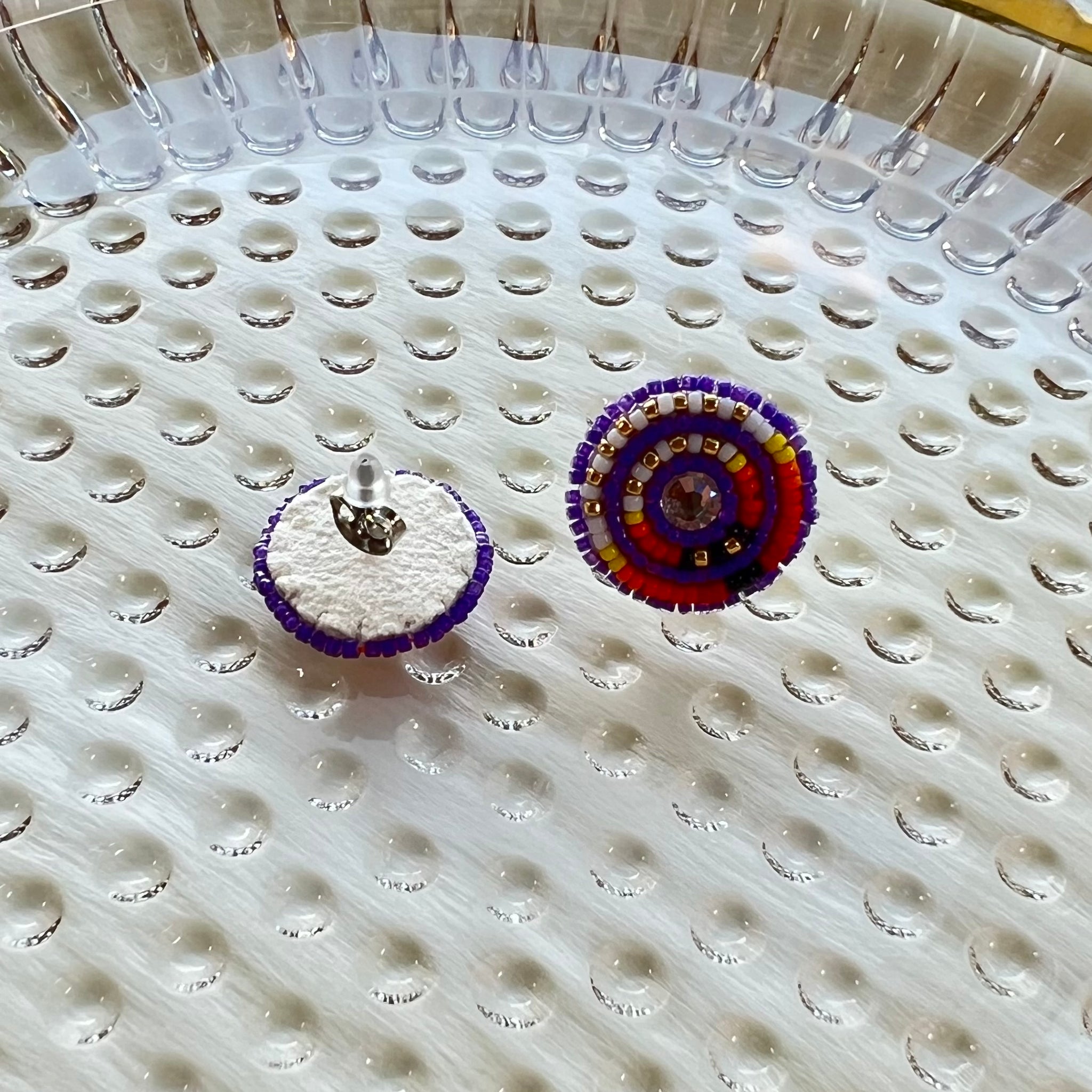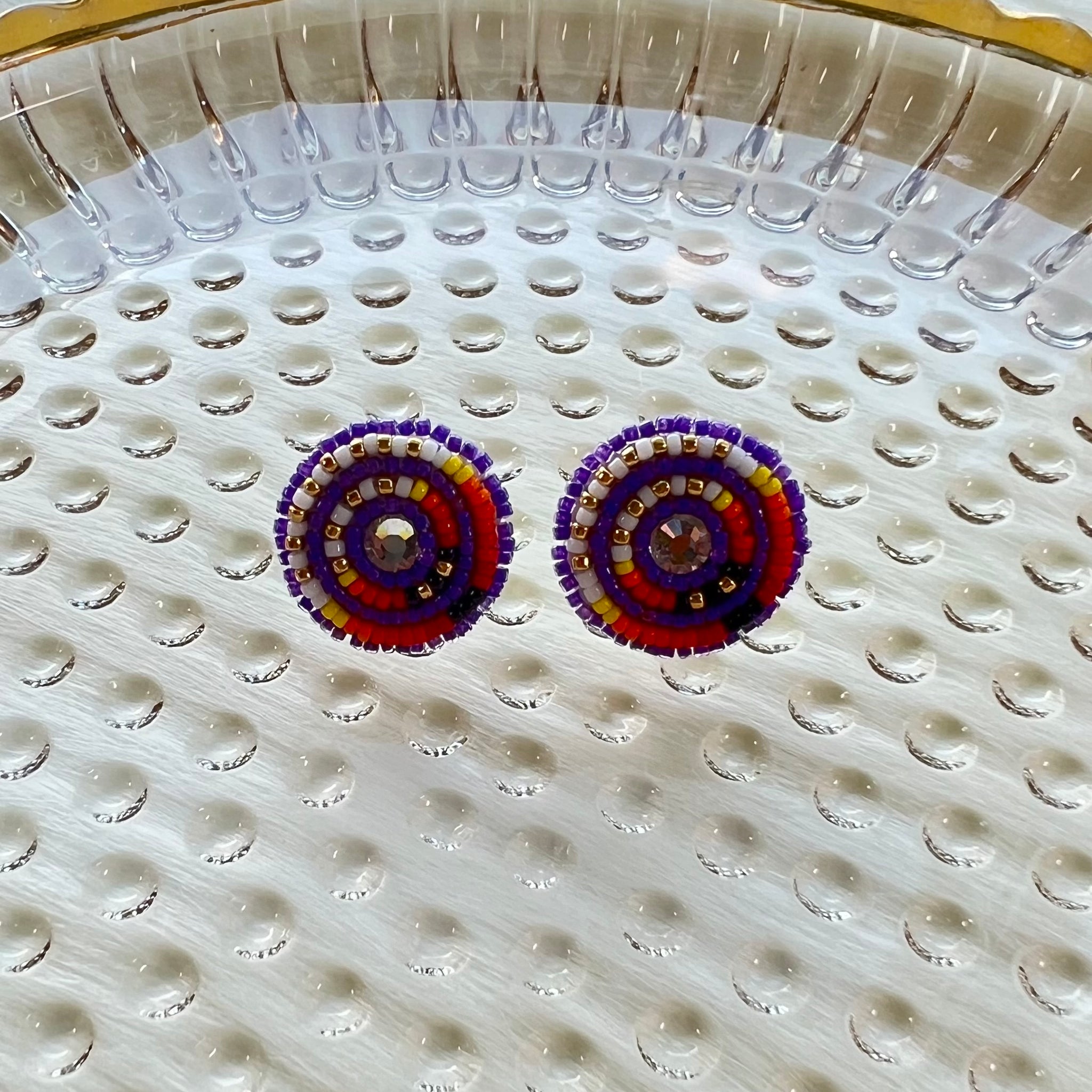 This pair of earrings are made with nylon thread, nickel free studs, Swarovski crystal gems, 24kt gold plated beads, and size 15 seed beads.