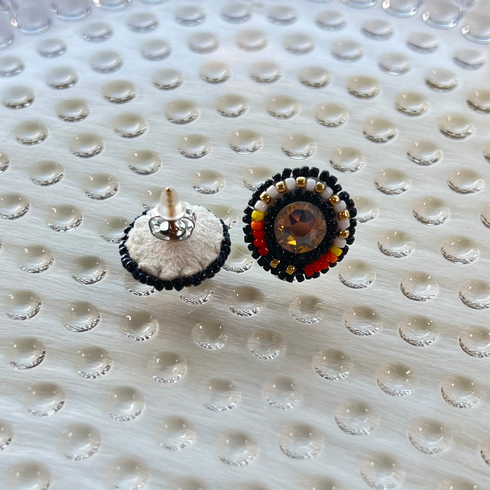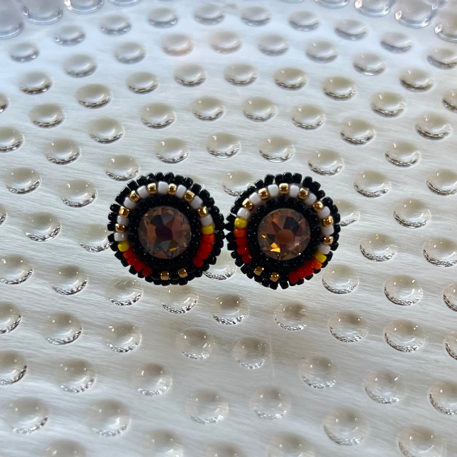 This pair of earrings are made with nylon thread, nickel free studs, Swarovski crystal gems, 24kt gold plated beads, and size 15 seed beads.